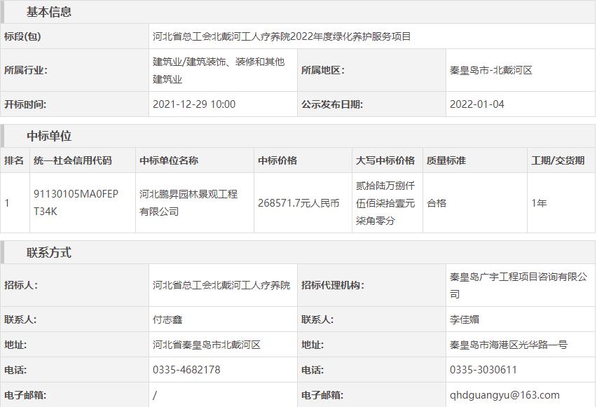 河北省总工会北戴河工人疗养院2022年度绿化养护服务项目中标公告