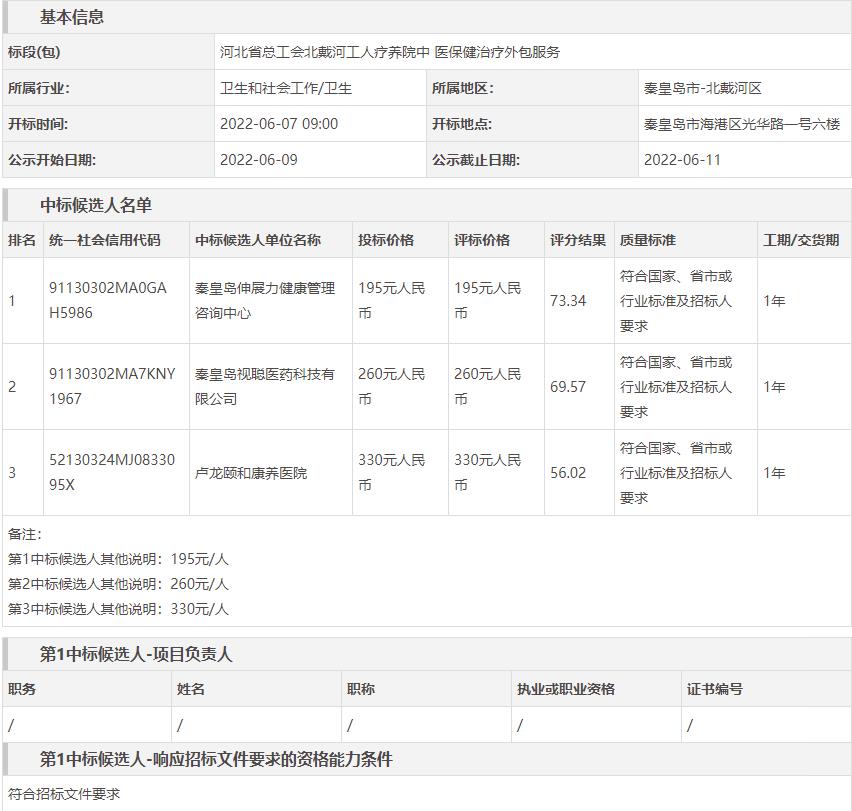 河北省总工会北戴河工人疗养院中 医保健治疗外包服务中标候选人公示