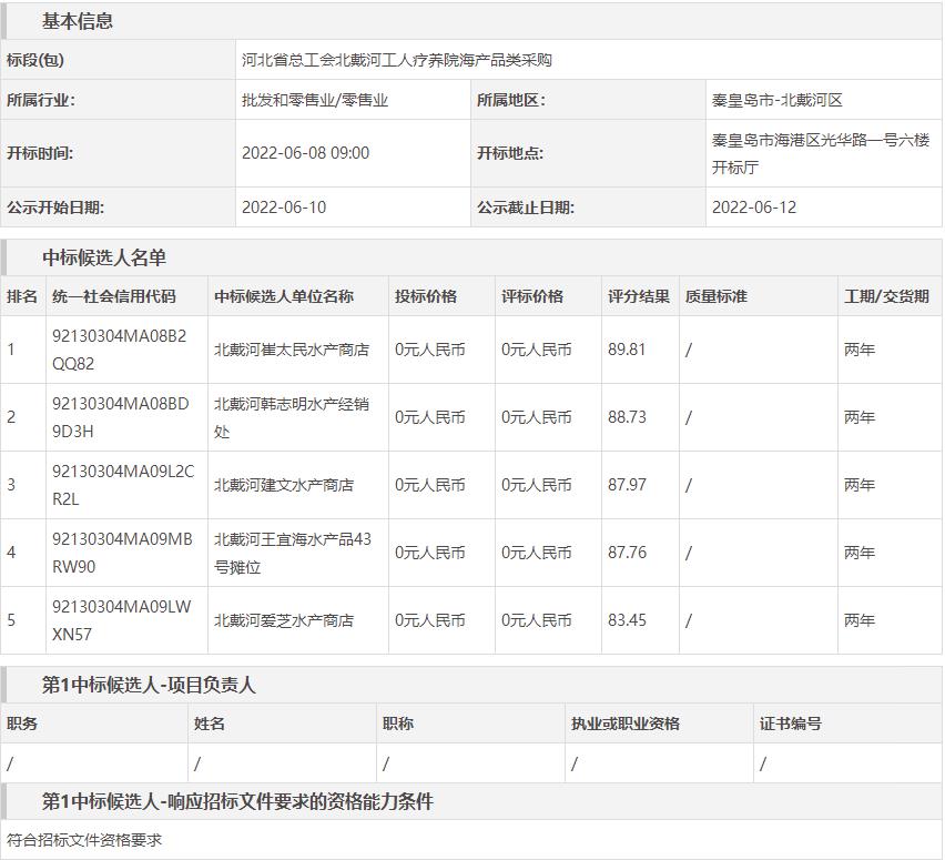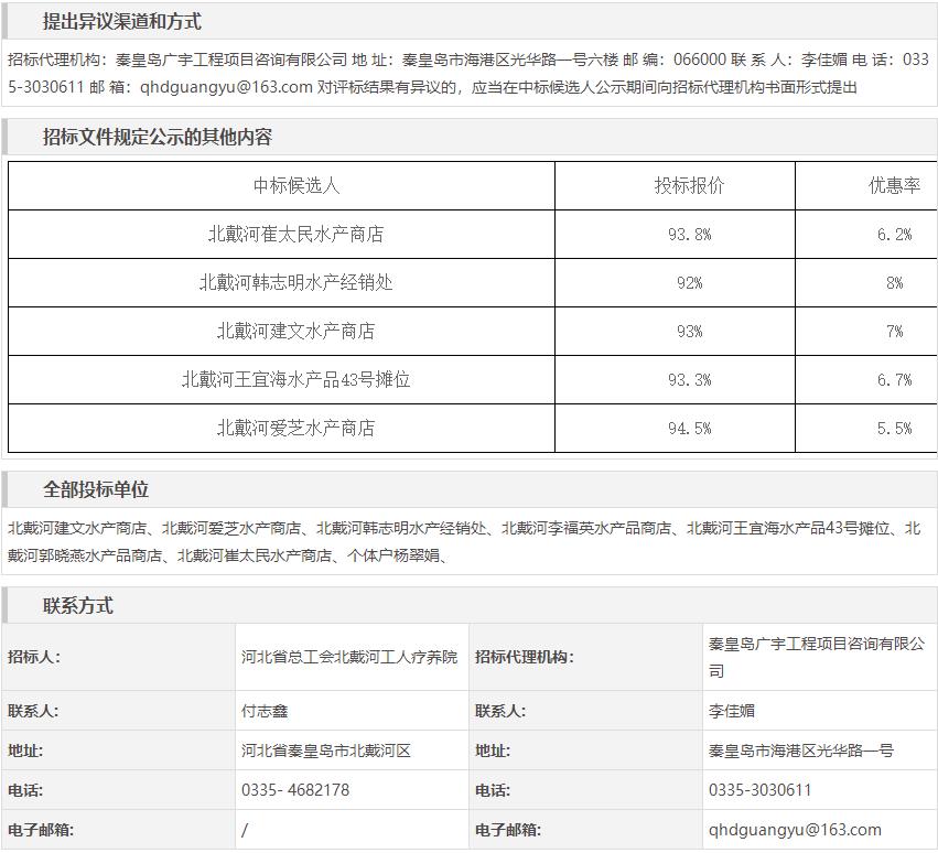 河北省总工会北戴河工人疗养院海产品类采购中标候选人公示
