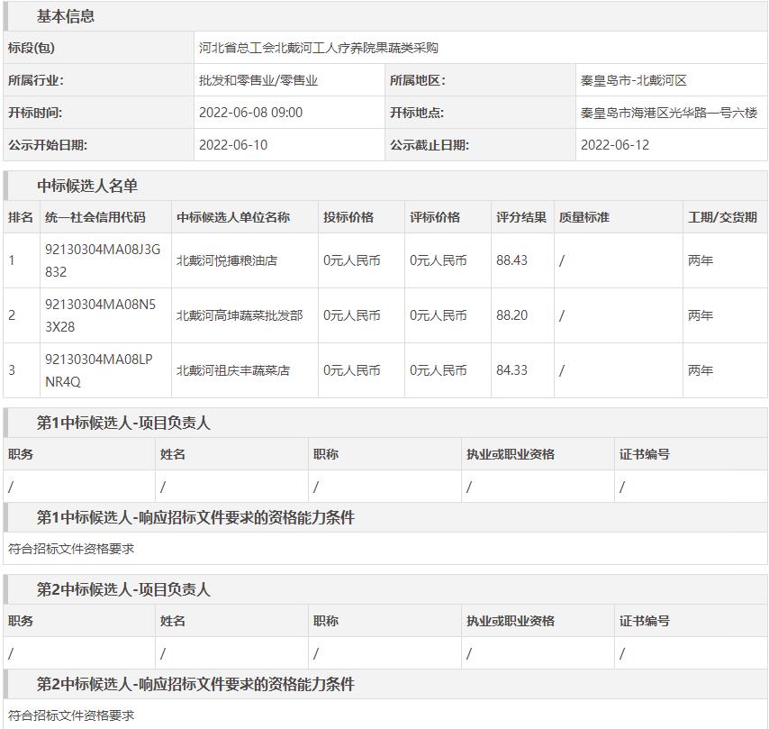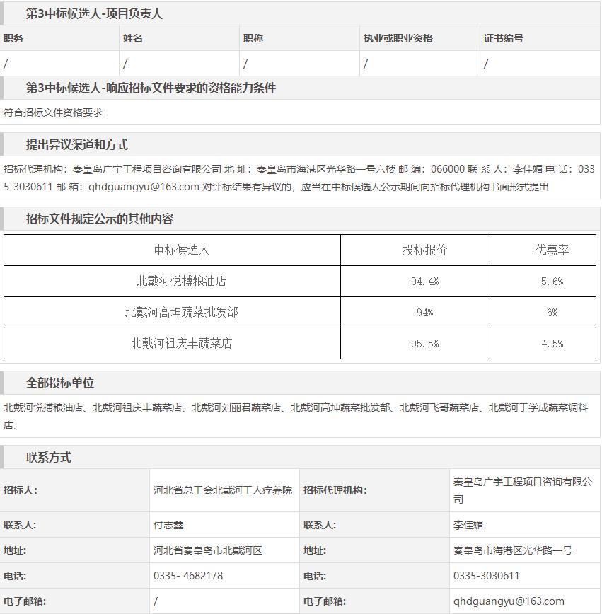 河北省总工会北戴河工人疗养院果蔬类采购中标候选人公示