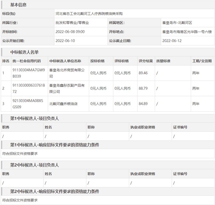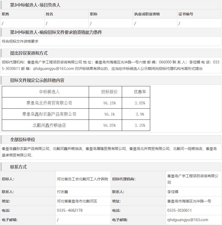 河北省总工会北戴河工人疗养院粮油类采购中标候选人公示