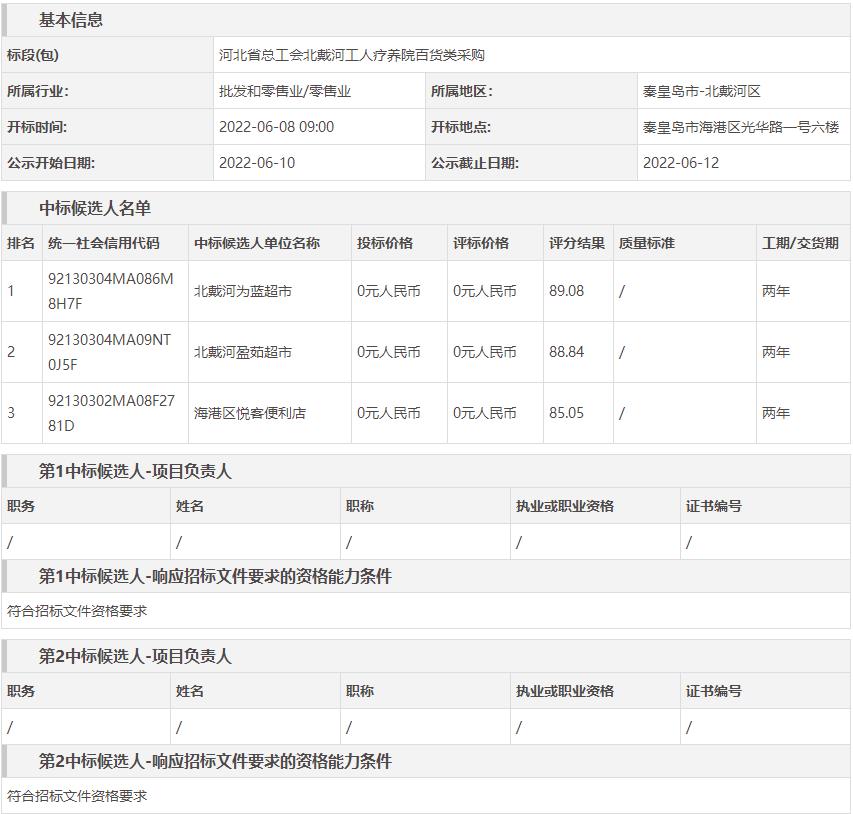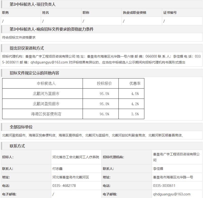 河北省总工会北戴河工人疗养院百货类采购中标候选人公示