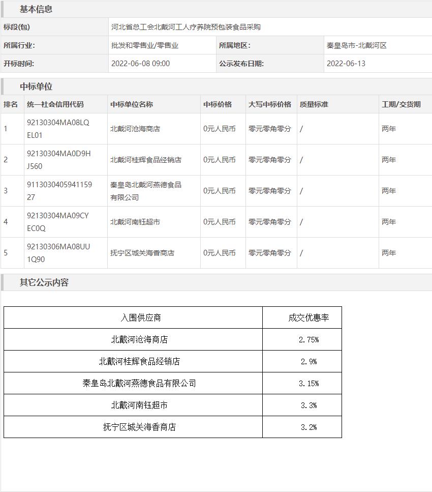 河北省总工会北戴河工人疗养院预包装食品采购中标结果公示