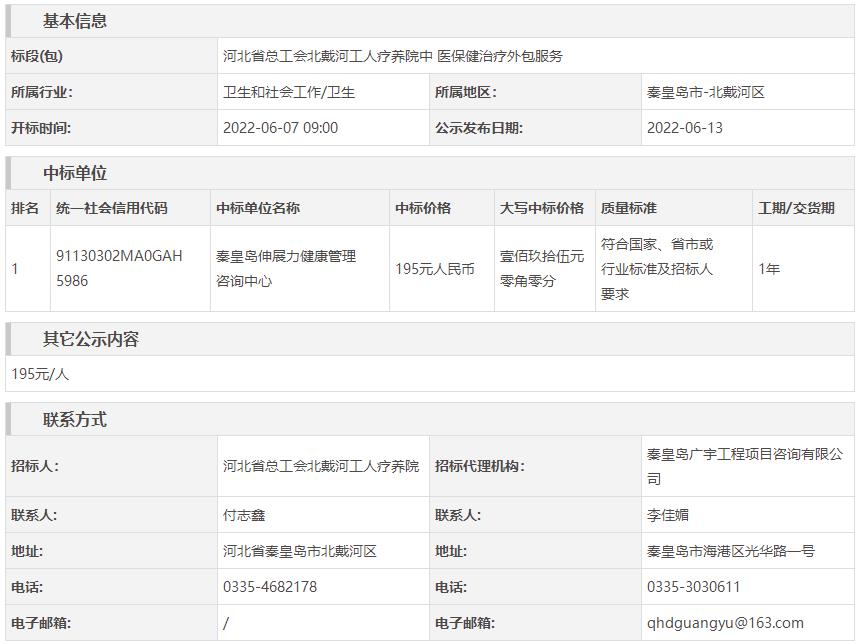 河北省总工会北戴河工人疗养院中 医保健治疗外包服务中标结果公示