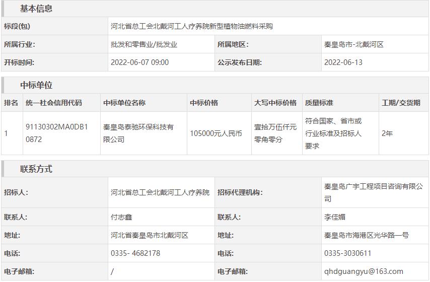 河北省总工会北戴河工人疗养院新型植物油燃料采购中标结果公示