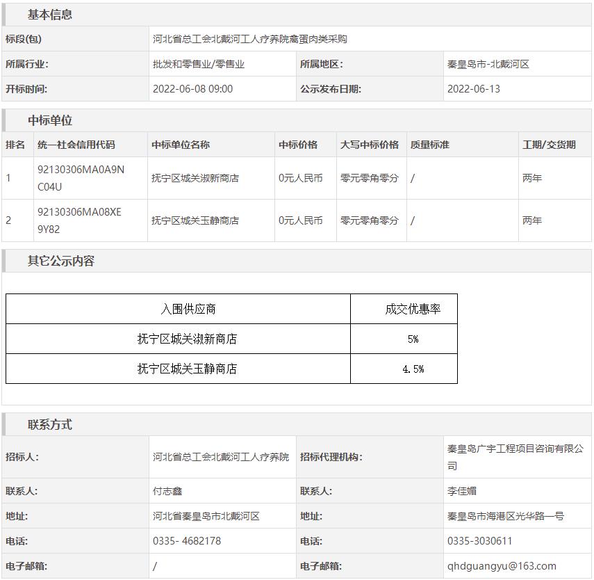 河北省总工会北戴河工人疗养院禽蛋肉类采购中标结果公示
