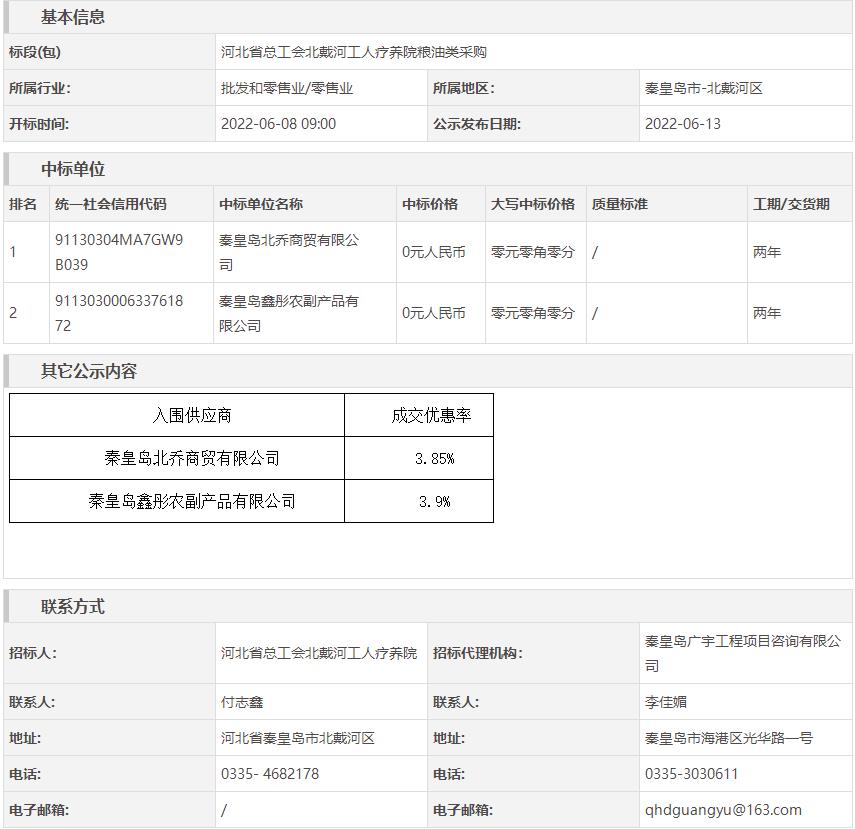 河北省总工会北戴河工人疗养院粮油类采购中标结果公示