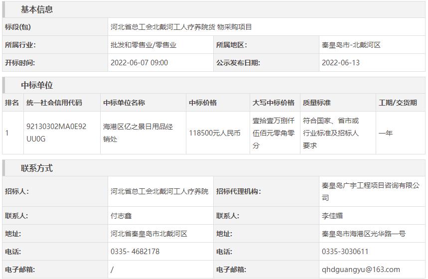 河北省总工会北戴河工人疗养院货 物采购项目中标结果公示