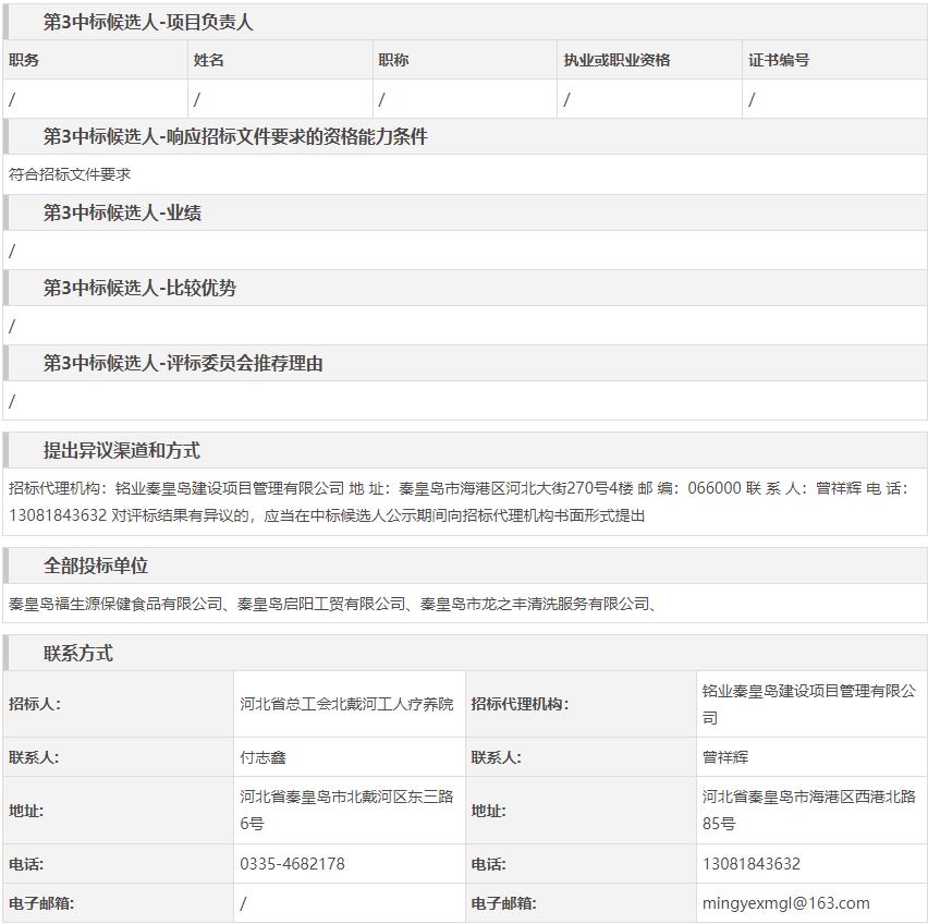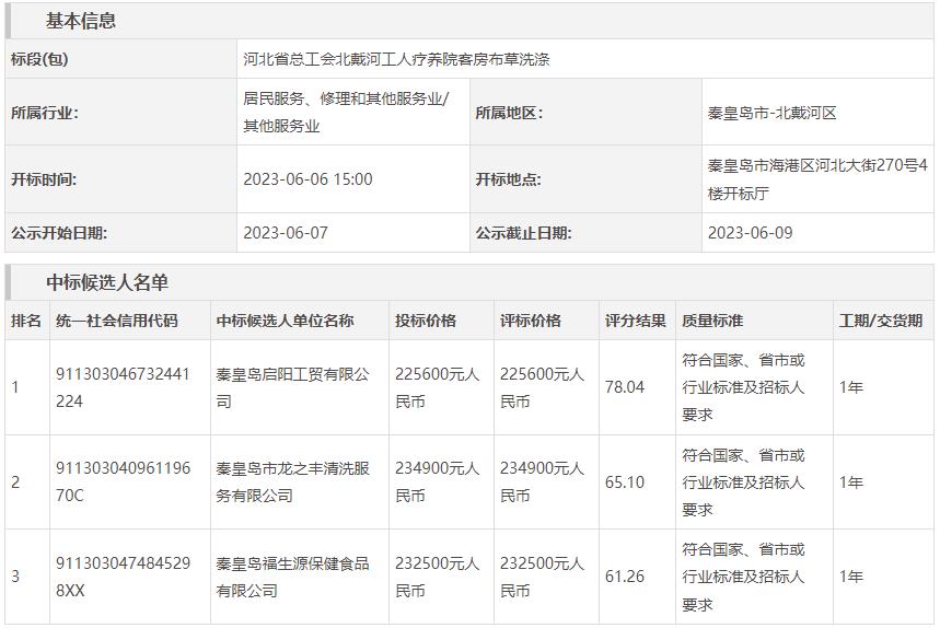 河北省总工会北戴河工人疗养院 客房布草洗 涤中标候选人公示