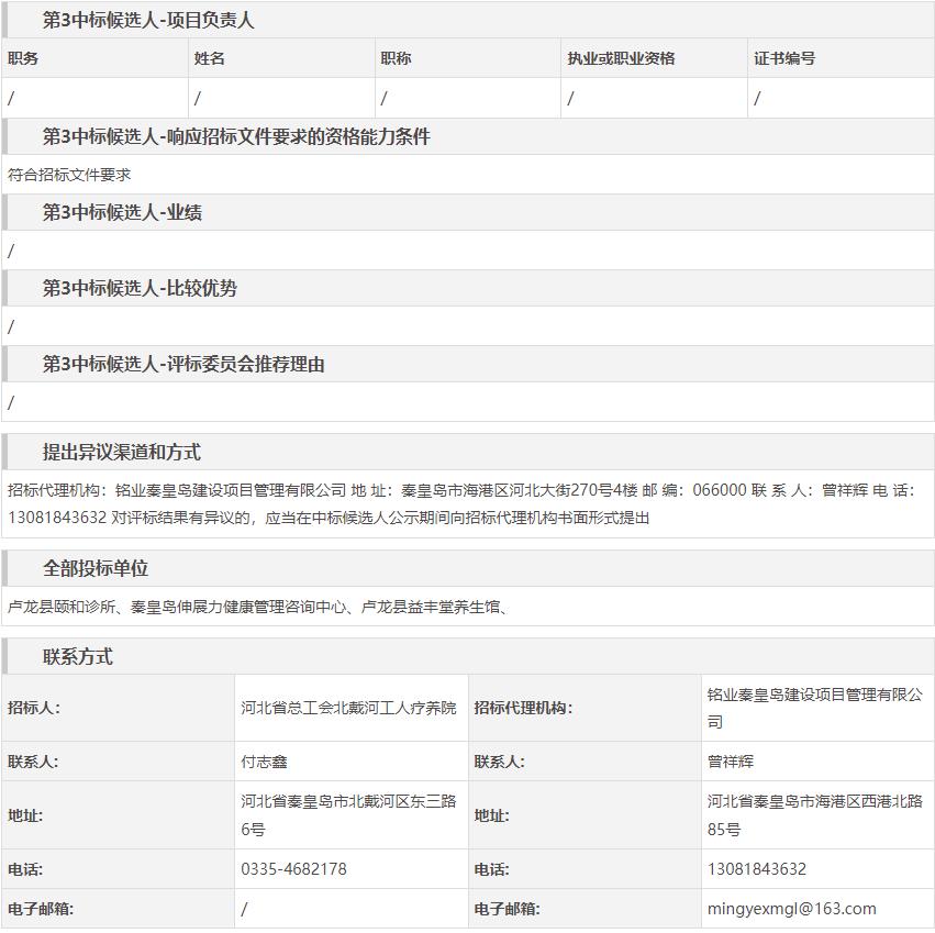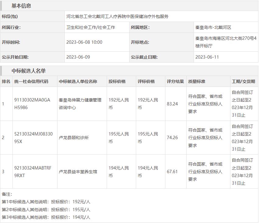 河北省总工会北戴河工人疗养院中医保健治疗外包服务中标候选人公示