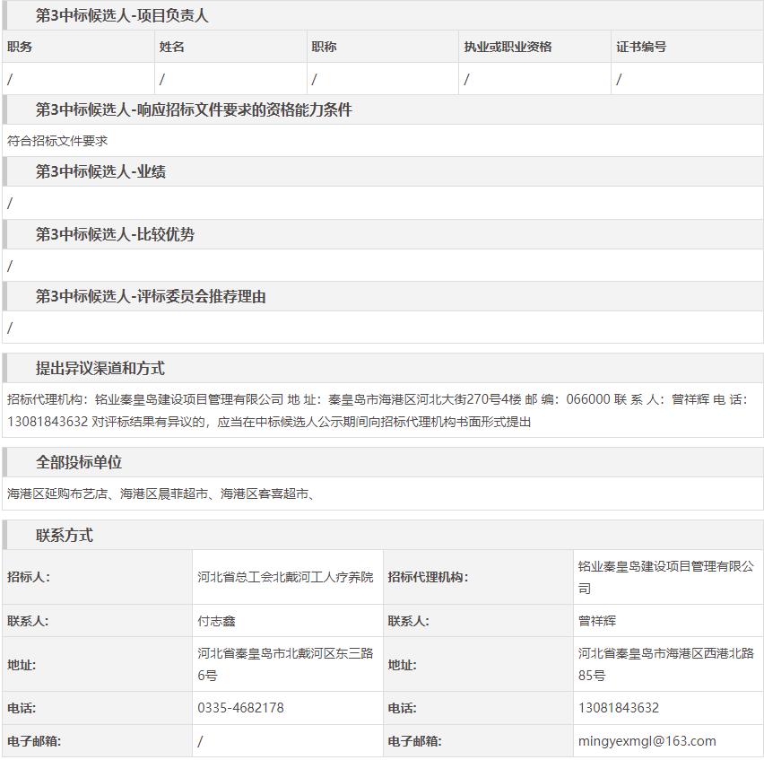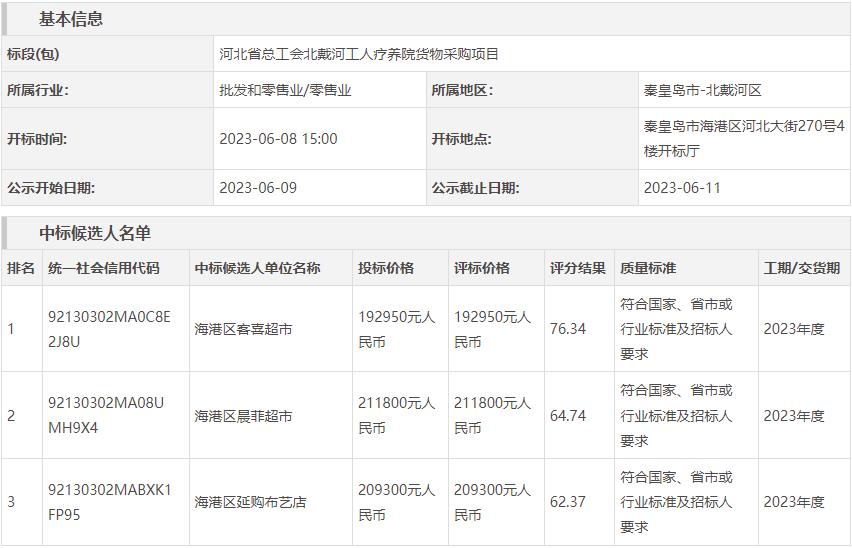 河北省总工会北戴河工人疗养院货 物 采购项目中标候选人公示