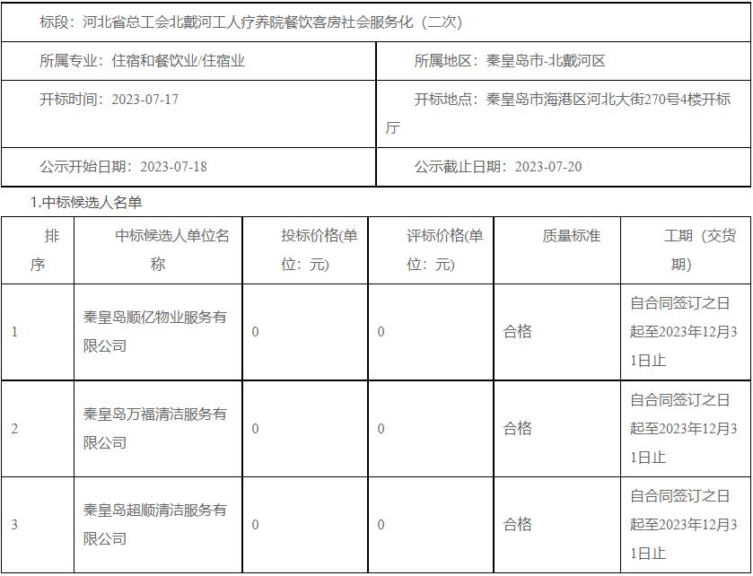 公示名称:河北省总工会北戴河工人疗养院餐饮客房社会服务化(二次)中标候选人公示