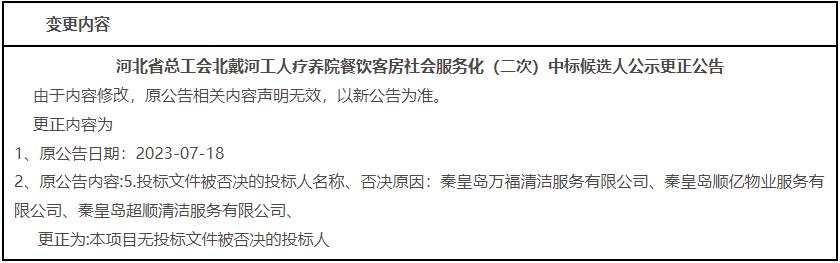 河北省总工会北戴河工人疗养院餐饮客房社会服务化(二次)更正公告