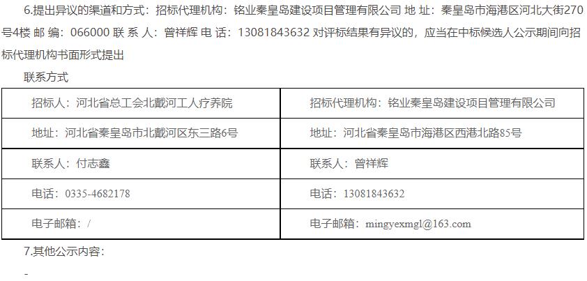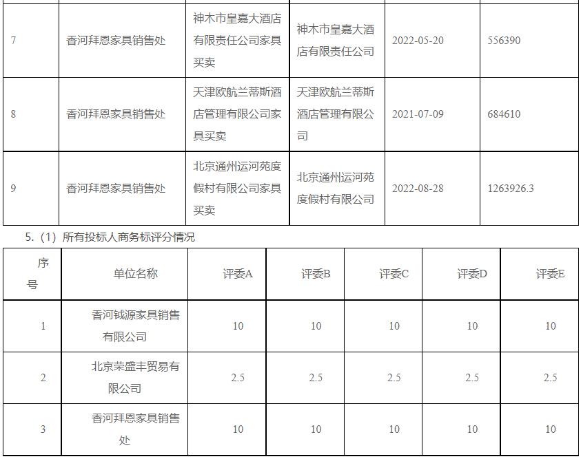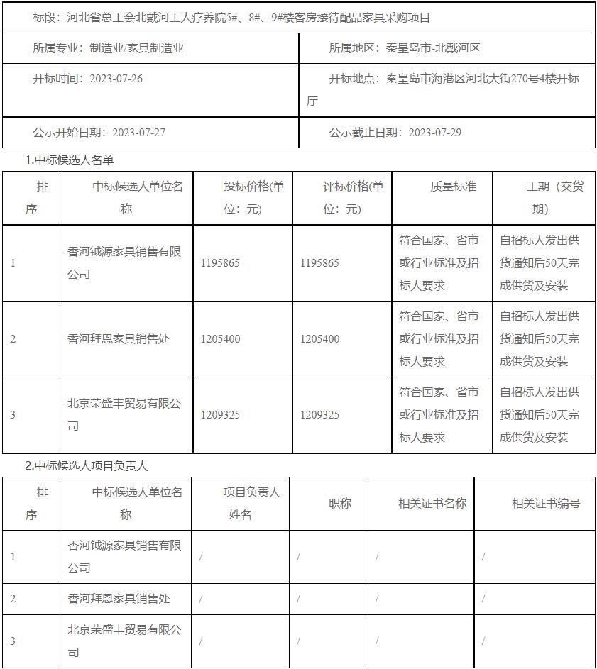 招标项目名称:河北省总工会北戴河工人疗养院5#、8#、9#楼客房接待配品家具采购项目 招标项目编号:I1300000001114598001 公示名称:河北省总工会北戴河工人疗养院5#、8#、9#楼客房接待配品家具采购项目中标候选人公示 公示编号:I1300000001114598001001001 公示内容: