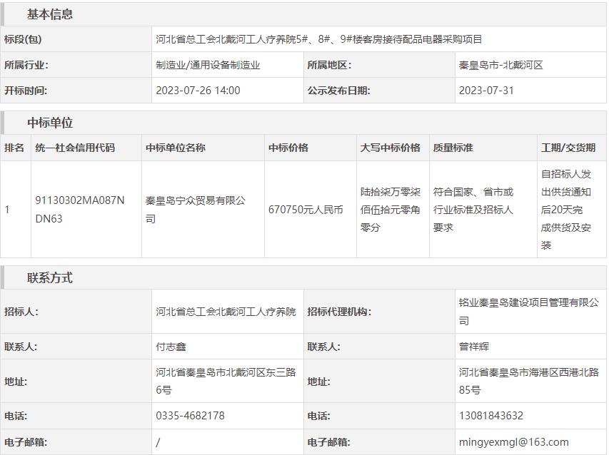 河北省总工会北戴河工人疗养院5#、8#、9#楼客房接待配品电器采购项目中标结果公示