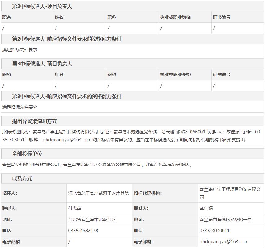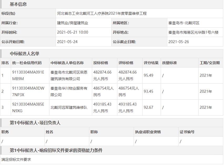 河北省总工会北戴河工人疗养院2021年度零星维修工程候选人公示