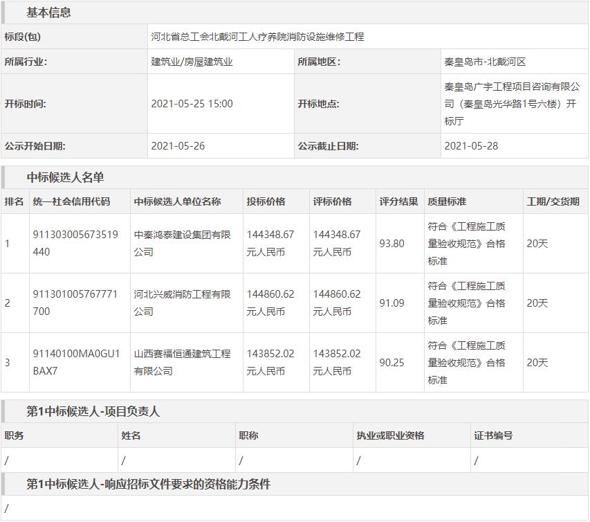 河北省总工会北戴河工人疗养院消防设施维修工程(二次)候选人公示