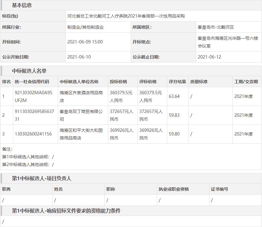 河北省总工会北戴河工人疗养院2021年客房部一次性用品采购