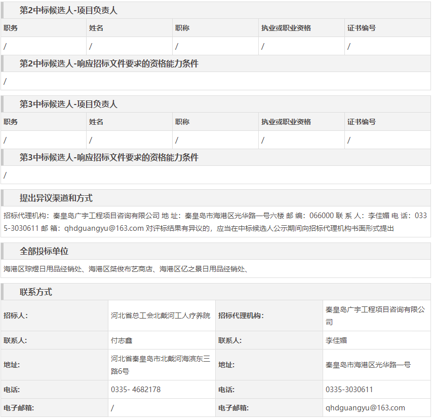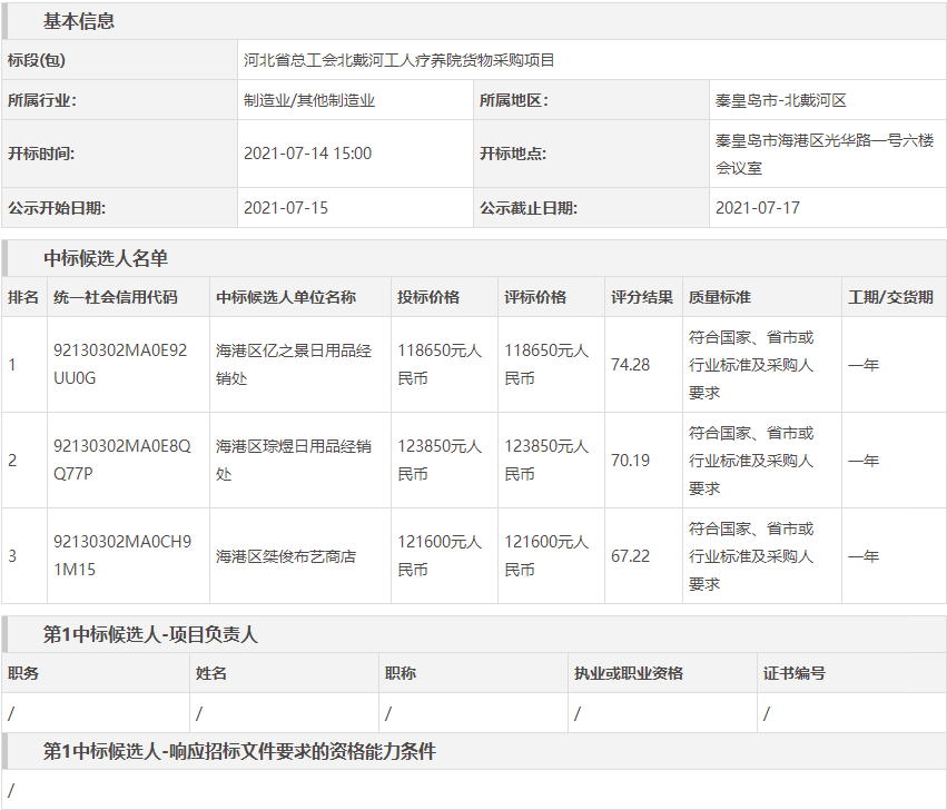 河北省总工会北戴河工人疗养院货物采购项目中标候选人公示